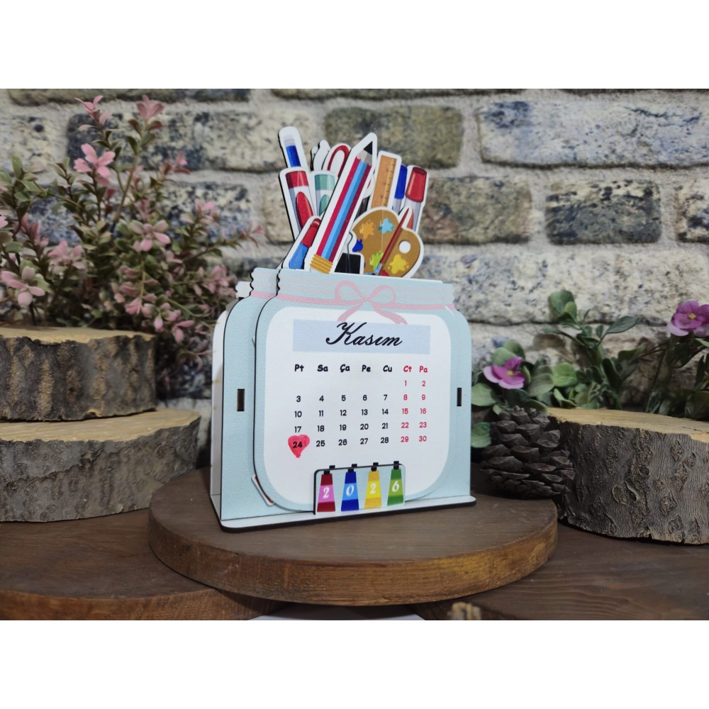 Ahşap malzemeden üretilen bu şık kalemlik, üzerindeki 2026 yıllık takvimle birlikte çalışma alanınıza estetik bir dokunuş kazandırır. Renkli kalem, fırça ve palet tasarımıyla özellikle öğretmenler, ressamlar ve ofis çalışanları için ideal bir masa aksesuarıdır.
