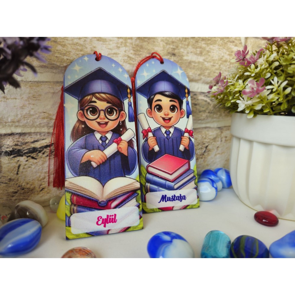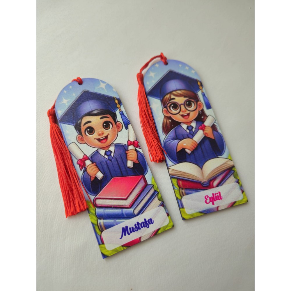 Renkli tasarımı ve sevimli mezuniyet illüstrasyonlarıyla bu özel kitap ayracı, çocukların mezuniyet sevincine eşlik etmek için hazır! Üzerinde kişiye özel isim bulunan model, hem hatıra değeri yüksek bir hediye hem de kitap okumayı daha keyifli hale getiren sevimli bir aksesuar.