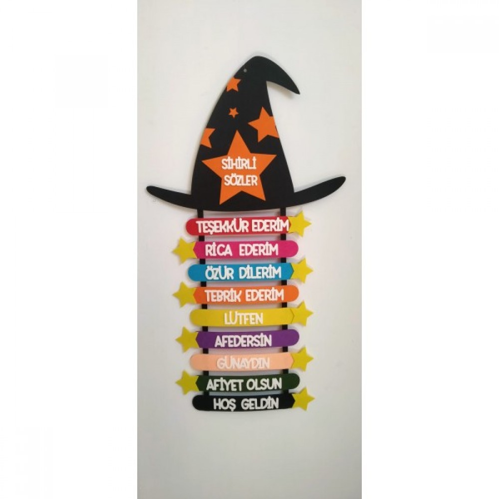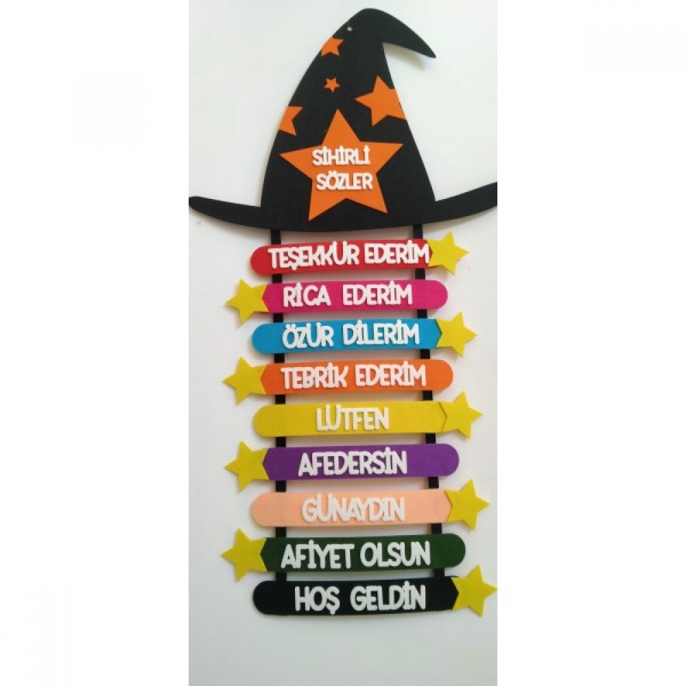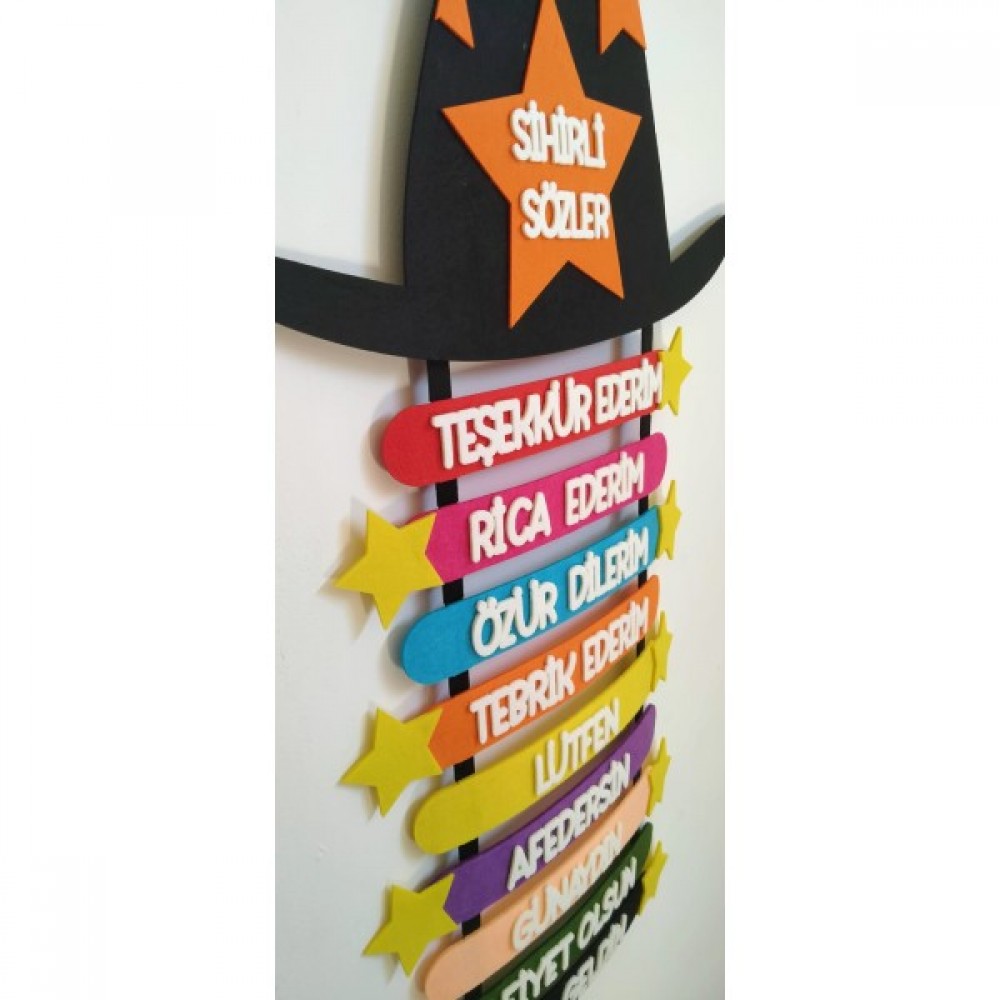 Sihirli sözcükler temalı keçe sınıf panomuz üst tarafında bulunan asma delikleri ile duvara kolayca monte edilebilir.
